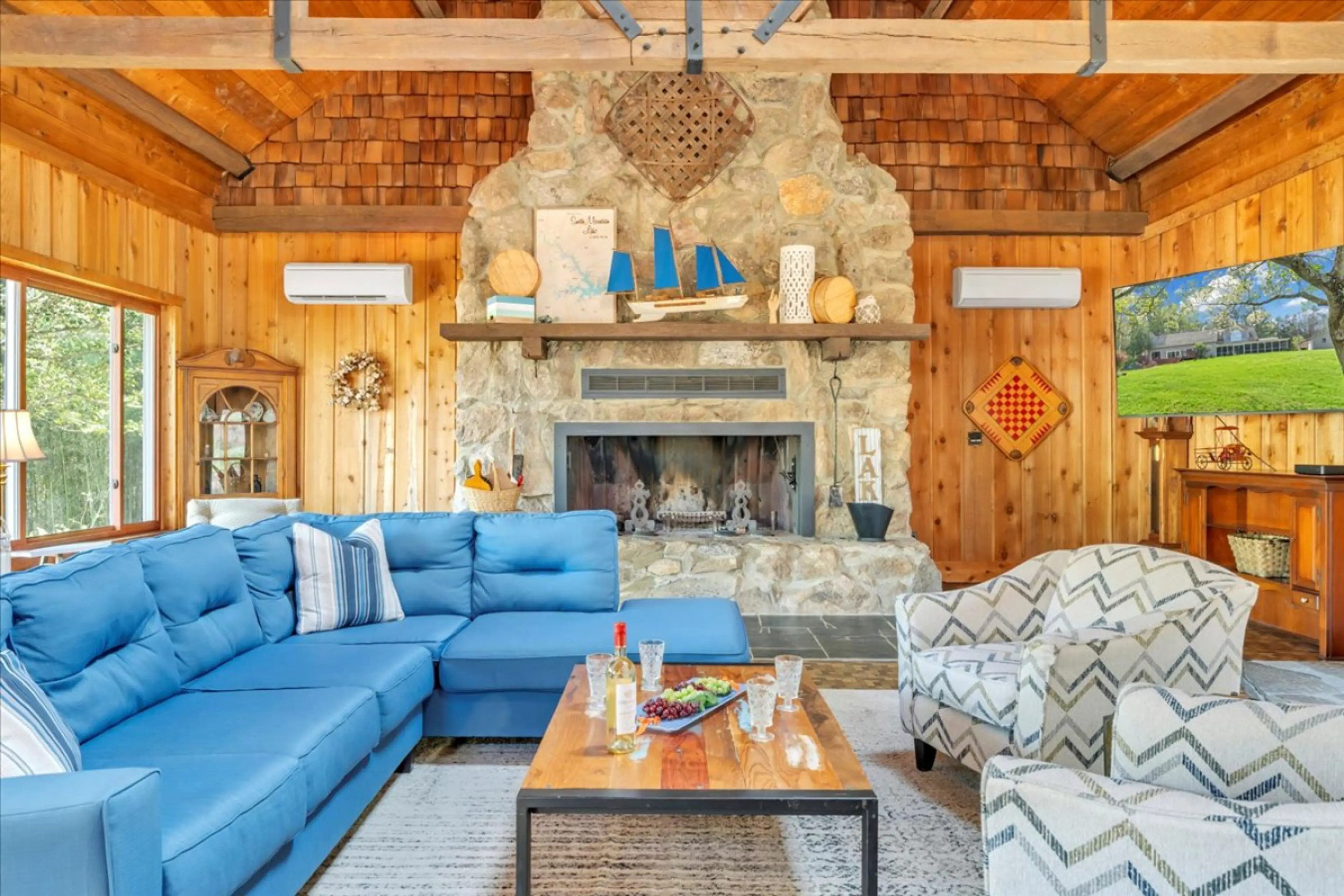 The lodge itself has everything you need—plenty of space inside, a wood-burning fireplace (again, BYO wood), and a gas grill that made cooking easy. Between the patios, sitting areas, and that view, it was hard to leave. Perfect spot for a laid-back weekend with friends or family.